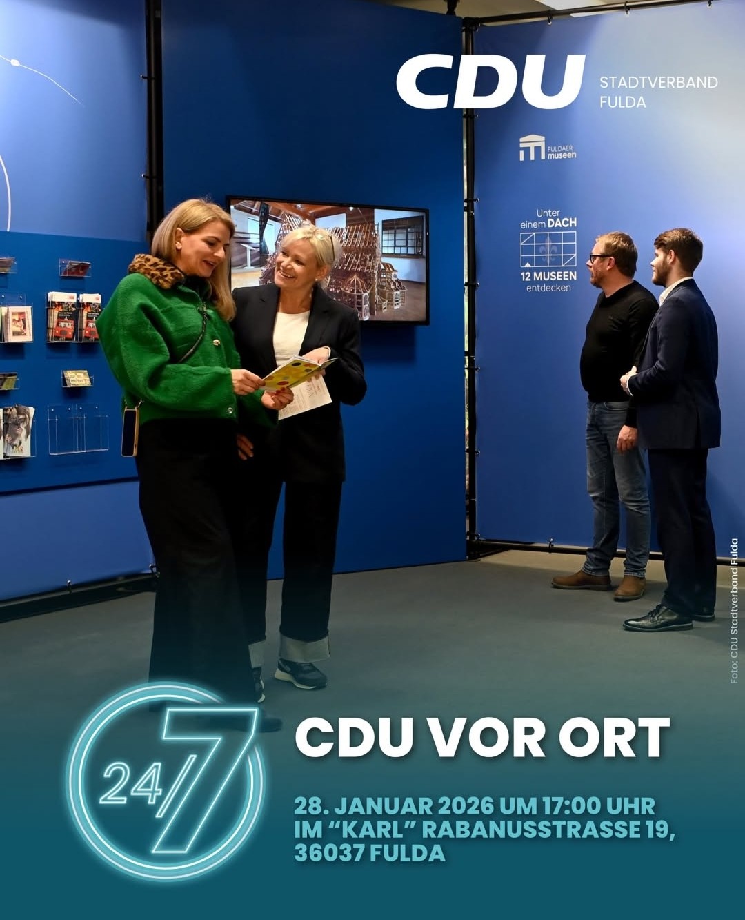 Der Arbeitskreis Schule, Kultur und Sport der CDU-Stadtverordnetenfraktion lädt alle interessierten Bürgerinnen und Bürger am Mittwoch, 28. Januar um 17 Uhr in das Konzepthaus KARL in Fulda herzlich ein. Dabei geht es um den Besuch und die Erläuterung der Ausstellung „Unter einem Dach - 12 Museen entdecken“.